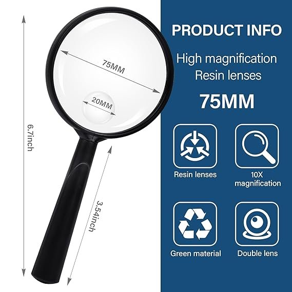 Lightweight acrylic magnifier with dual magnification (10X & 30X) for clear viewing of small text and fine details. Features a non-slip ergonomic handle for comfortable, long-term use.